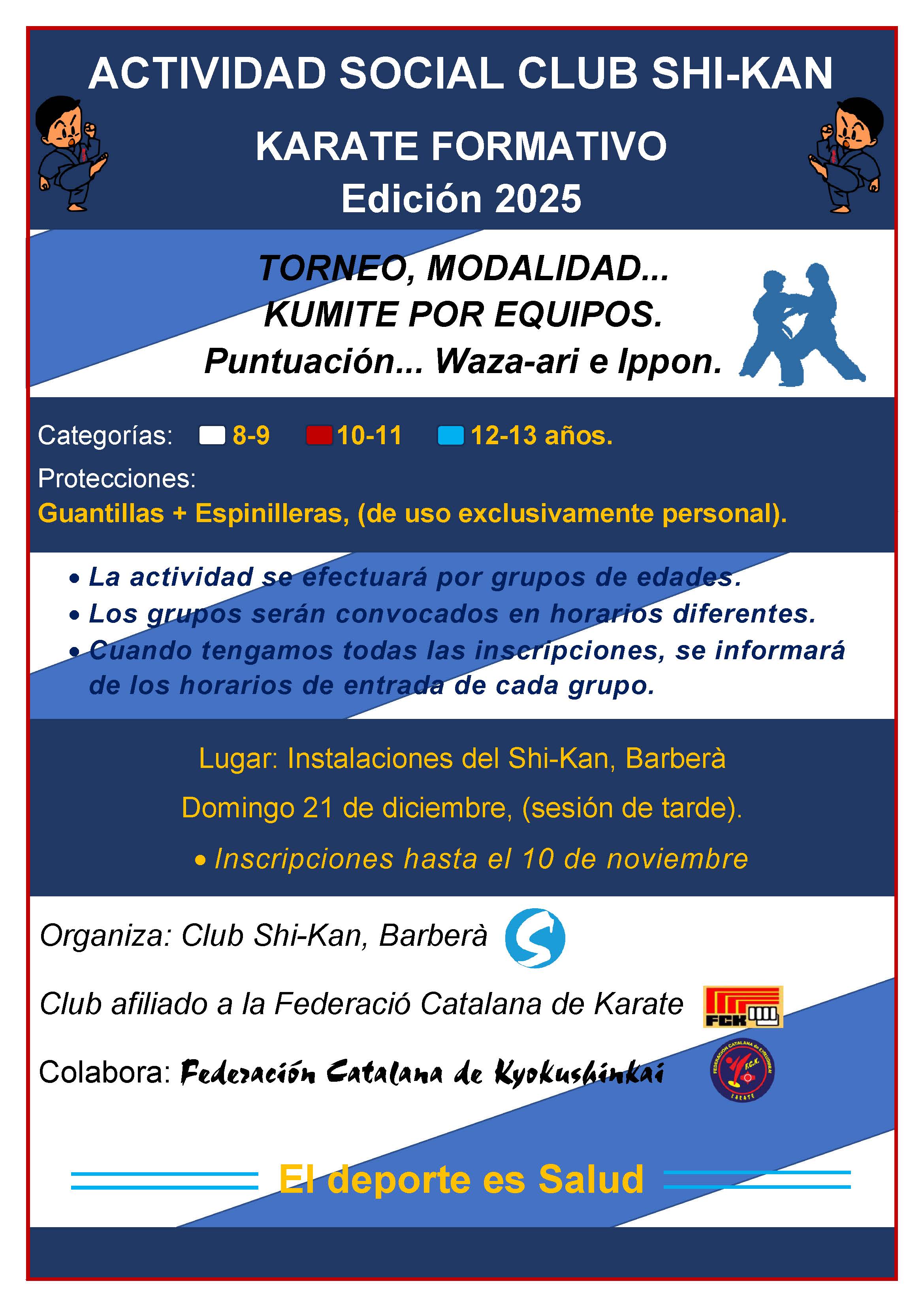 | 10 de mayo | Campeonato de Catalunya Kyokushin. Kata y Kumite. Categorías, Alevín (8-9) Infantil (10-11) Juvenil (12-13).