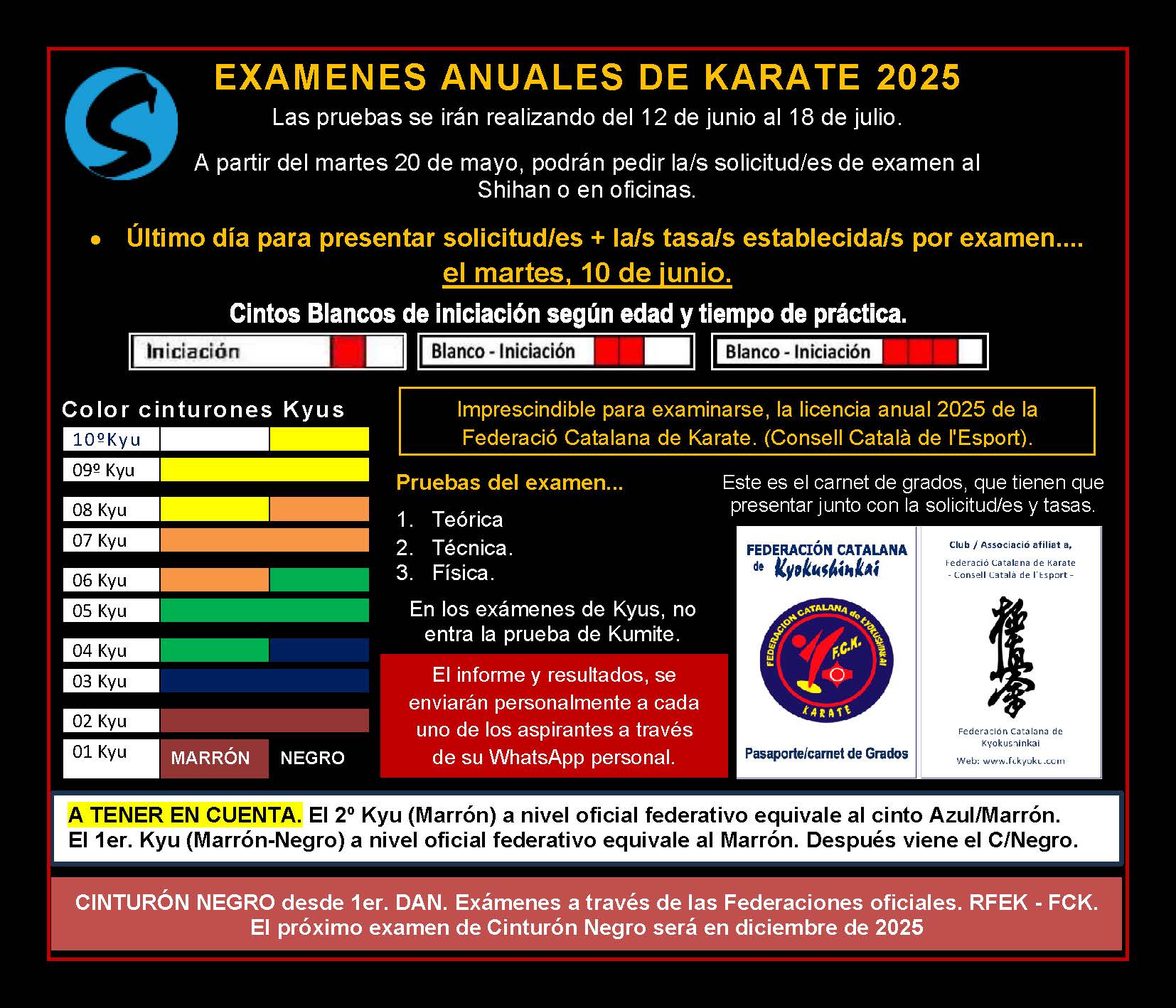 • INFO: La Federació Catalana de Karate y la Real Federación Española de Karate, son los únicos organismos oficiales que puede convocar exámenes de Cinturón Negro y titulaciones regladas de enseñanza.